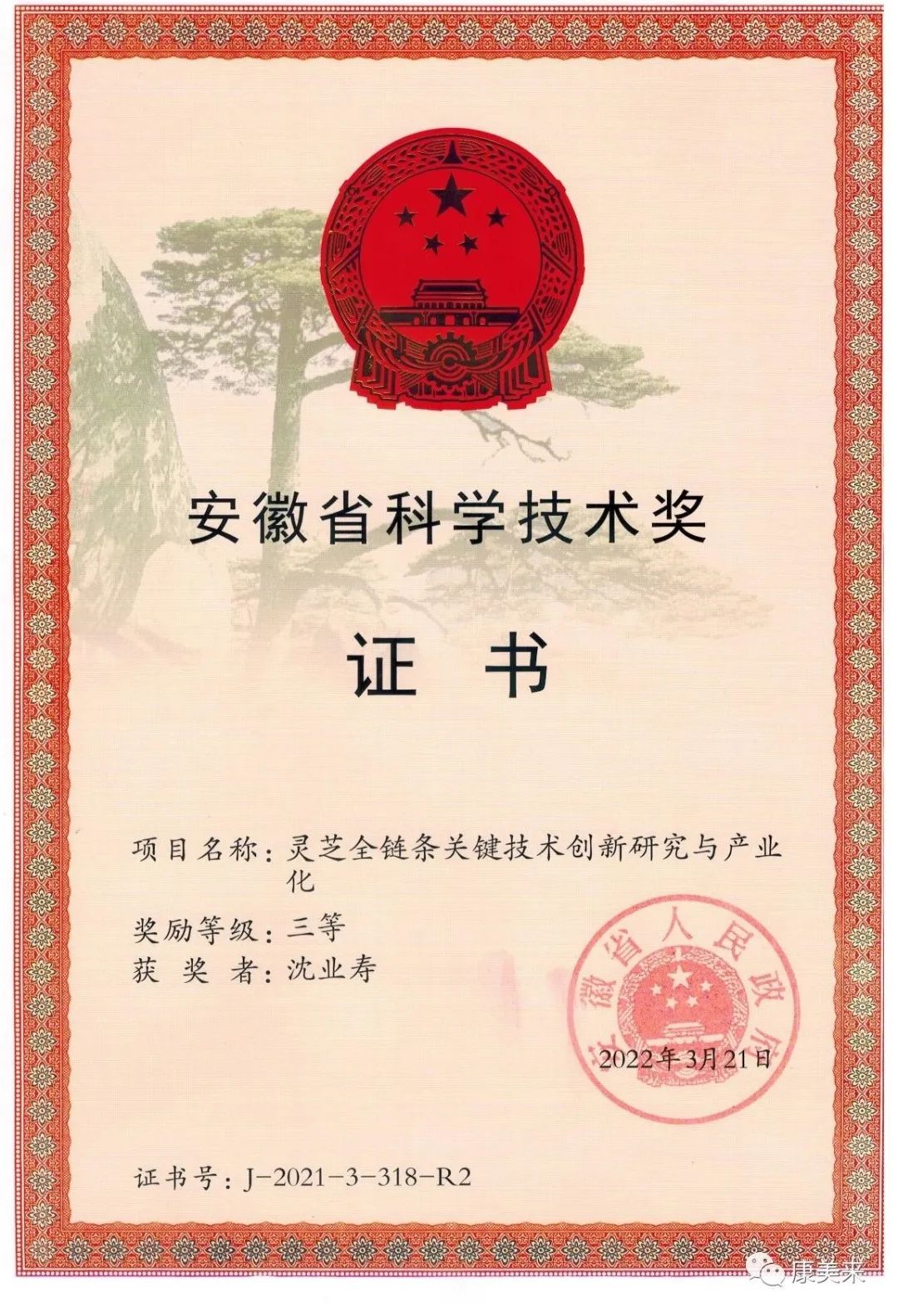 安徽省人民政府向安徽省康美來大別山生物科技有限公司、安徽大學(xué)沈業(yè)壽教授等單位和個(gè)人頒發(fā)“安徽省科技技術(shù)獎(jiǎng)”證書,這是康美來公司與安徽大學(xué)開展產(chǎn)學(xué)研合作十五年在大別山靈芝研究領(lǐng)域取得的重大成就,得到省、市、縣政府的高度肯定。