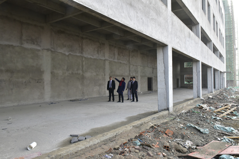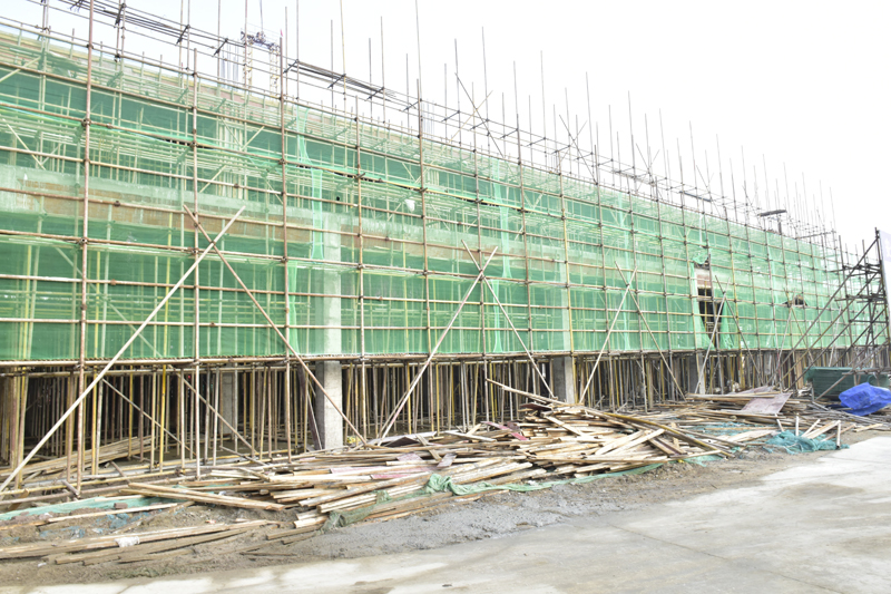 6層高的高檔公寓樓已經(jīng)完成封頂,腳手架林立,預(yù)計(jì)2019年3月前完成墻面工程。