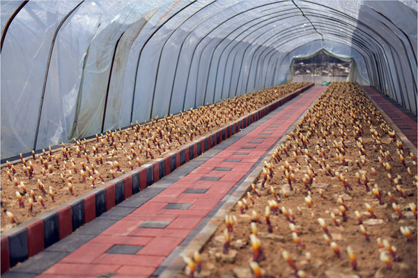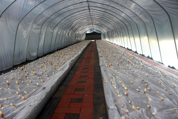 早期栽培的靈芝已長(zhǎng)出嫩芽,色澤鮮艷,整齊排列,迎接遠(yuǎn)方的客人。